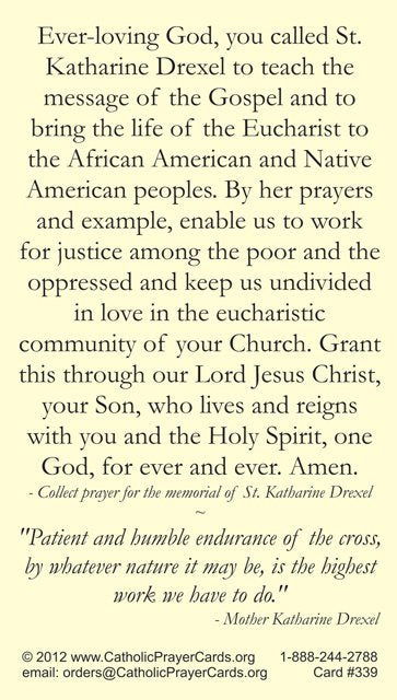 Keep God in LifeSt. Katherine Drexel Prayer Card 3.5" x 2" card Made out of glossy cardstock Ten prayer cards included Also included are two free bonus cards...