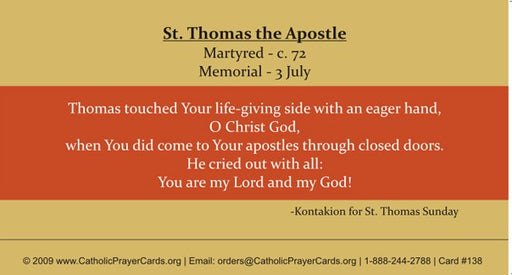 Keep God in LifeSt. Thomas the Apostle LAMINATED Prayer Card 3.5" x 2" card Made out of glossy cardstock Ten prayer cards included Also included are two fre...