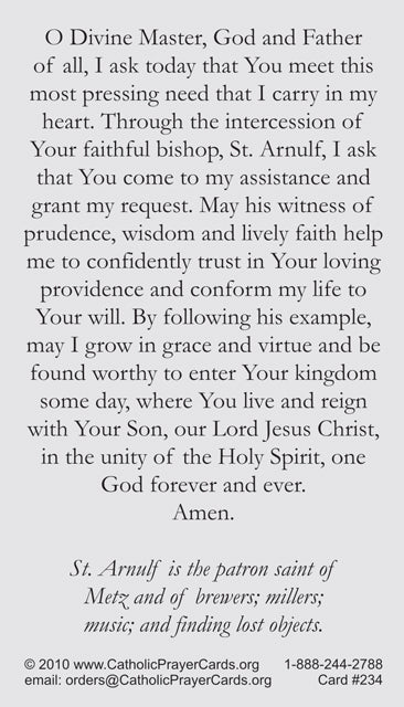 Keep God in LifeSt. Arnold Prayer Card He is also known as Saint Arnulf 3.5" x 2" card Ten Prayer cards included Two free bonus cards will be included, one of ...