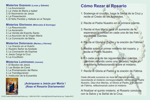 Keep God in LifeSpanish How to Pray the Rosary Como Rezar el Rosario Card size: 4" x 6" Five prayer cards included Also included are two free bonus cards, on...