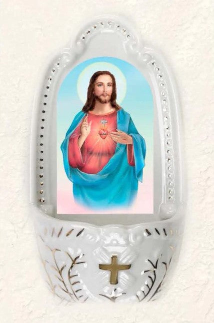5-1/4 Inch Porcelain Holy Water Font featuring The Sacred Heart of Jesus